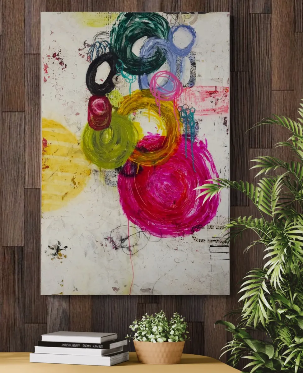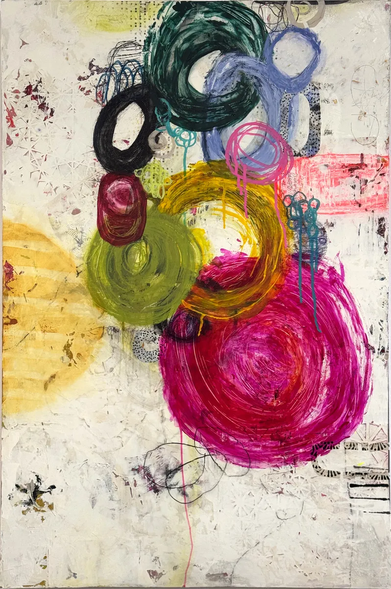 Grace in motion, unfolding through layers of color and texture. "Grace Unfolding" is a vibrant exploration of movement, texture, and emotion. Layers of collage, paint, and intricate mark-making come together in an organic dance of color and form. The floating circular elements evoke a sense of growth, transformation, and the delicate unfolding of grace through time. Each mark, each textured layer, tells a story of resilience and beauty emerging from the abstract. This piece invites the viewer to pause, reflect, and embrace the fluidity of change.